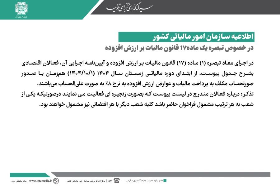 در اجرای مفاد تبصره (۱) ماده (۱۷) قانون مالیات بر ارزش افزوده و آیین‌نامه اجرایی آن، فعالان اقتصادی بشرح جدول پیوست ، از ابتدای دوره مالیاتی زمستان سال ۱۴۰۴ (۱۴۰۴/۱۰/۰۱) هم‌زمان با صدور صورتحساب مکلف به پرداخت مالیات و عوارض ارزش افزوده به نرخ ۸% به صورت علی‌الحساب می‌باشند.