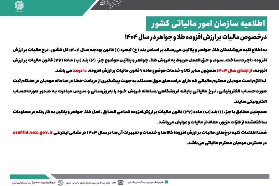 به اطلاع کلیه فروشندگان طلا، جواهر و پلاتین میرساند بر اساس بند (خ) تبصره (۱) قانون بودجه سال ۱۴۰۴ کل کشور، نرخ مالیات بر ارزش افزوده «اجرت ساخت، سود، و حق العمل مربوط به فروش طلا، جواهر و پلاتین موضوع جزء (۲) بند (ب) ماده (۲۶) قانون مالیات بر ارزش افزوده» از ابتدای سال ۱۴۰۴ همچون سایر کالا و خدمات موضوع ماده ۷ قانون مالیات بر ارزش افزوده، ۱۰ درصد می باشد.