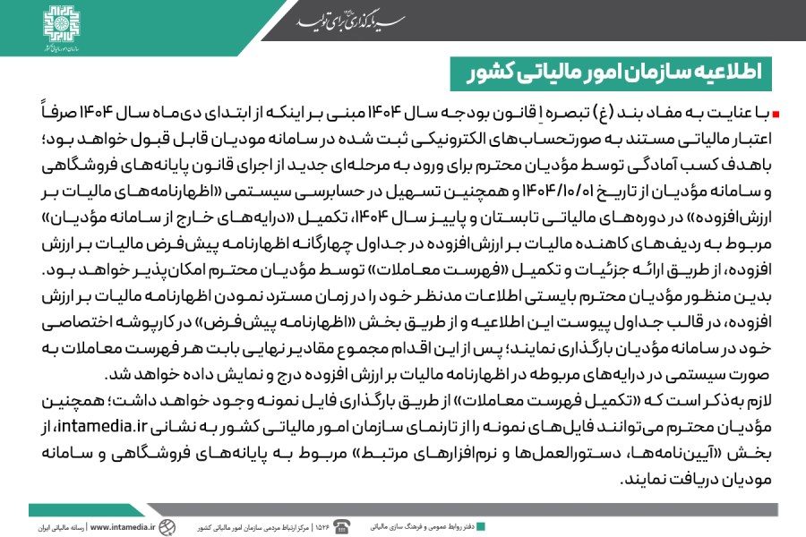 با عنایت به مفاد بند (غ) تبصره ۱ قانون بودجه سال ۱۴۰۴ مبنی بر اینکه از ابتدای دیماه سالجاری صرفاً اعتبار مالیاتی مستند به صورتحسابهای الکترونیکی ثبت شده در سامانه مودیان قابل قبول خواهد بود؛ باهدف کسب آمادگی توسط مؤدیان محترم برای ورود به مرحلهای جدید از اجرای قانون پایانههای فروشگاهی و سامانه مؤدیان از تاریخ ۱۴۰۴.۱۰.۱ و همچنین تسهیل در حسابرسی سیستمی «اظهارنامههای مالیات بر ارزشافزوده» در دورههای مالیاتی تابستان و پاییز سال ۱۴۰۴، تکمیل «درایههای خارج از سامانه مؤدیان» مربوط به ردیفهای کاهنده مالیات بر ارزشافزوده در جداول چهارگانه اظهارنامه پیشفرض مالیات بر ارزشافزوده، از طریق ارائه جزئیات و تکمیل «فهرست معاملات» توسط مؤدیان محترم امکانپذیر خواهد بود.