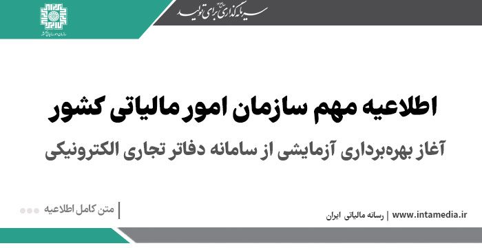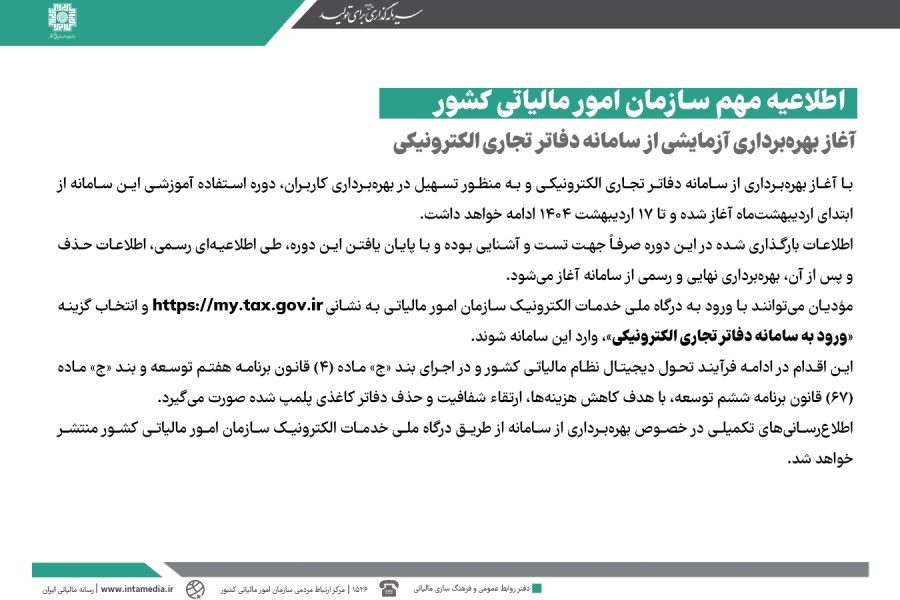 اطلاعرسانیهای تکمیلی در خصوص بهرهبرداری از سامانه از طریق درگاه ملی خدمات الکترونیک سازمان امور مالیاتی کشور منتشر خواهد شد.