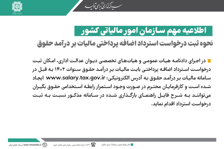 در اجرای دادنامه هیات عمومی و هیاتهای تخصصی دیوان عدالت اداری، امکان ثبت درخواست استرداد اضافه پرداختی بابت مالیات بر درآمد حقوق سنوات۱۴۰۲ به قبل در سامانه مالیات بر درآمد حقوق به آدرس الکترونیکی: www.salary.tax.gov.ir ایجاد شده است و کارفرمایان محترم در صورت وجود استمرار رابطه استخدامی حقوق بگیران میتوانند به شرح فایل راهنمای بارگذاری شده در سامانه مذکور نسبت به ثبت درخواست استرداد اقدام نماید.