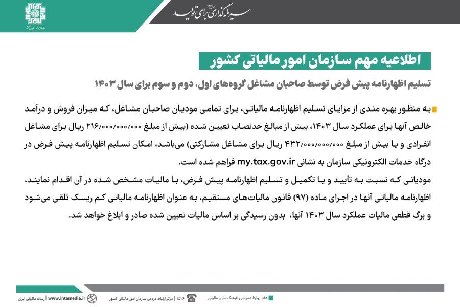 به منظور بهره مندی از مزایای تسلیم اظهارنامه مالیاتی برای تمامی مودیان صاحبان مشاغلی که میزان فروش و درآمد خالص آنها برای عملکرد سال ۱۴۰۳، بیش از مبالغ حدنصاب تعیین شده (۲۱ میلیارد و ۶۰۰ میلیون تومان برای مشاغل انفرادی) و یا بیش از مبلغ (۴۳ میلیارد و ۲۰۰ میلیون تومان برای مشاغل مشارکتی) باشد امکان تسلیم اظهارنامه پیش فرض در درگاه خدمات الکترونیکی سازمان به نشانی my.tax.gov.ir فراهم شده است.