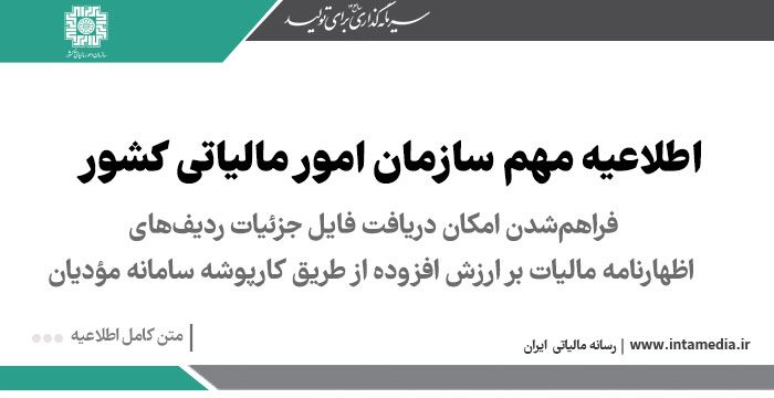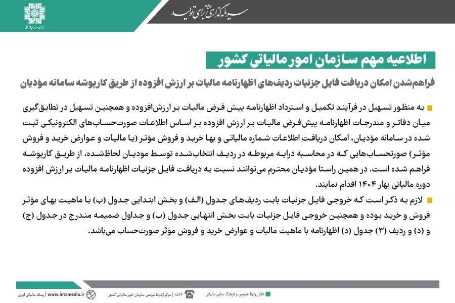 به منظور تسهیل در فرآیند تکمیل و استرداد اظهارنامه پیش فرض مالیات بر ارزش افزوده و همچنین تسهیل در تطابقگیری میان دفاتر و مندرجات اظهارنامه پیشفرض مالیات بر ارزش افزوده بر اساس اطلاعات صورتحسابهای الکترونیکی ثبت شده در سامانه مؤدیان، امکان دریافت اطلاعات شماره مالیاتی و بها خرید و فروش مؤثر (یا مالیات و عوارض خرید و فروش مؤثر) صورتحسابهایی که در محاسبه درایه مربوطه در ردیف انتخابشده توسط مودیان لحاظشده، از طریق کارپوشه فراهم شده است. در همین راستا مؤدیان محترم میتوانند نسبت به دریافت فایل جزئیات اظهارنامه مالیات بر ارزش افزوده دوره مالیاتی بهار ۱۴۰۴ اقدام نمایند. لازم به ذکر است که خروجی فایل جزئیات بابت ردیفهای جدول (الف) و بخش ابتدایی جدول (ب) با ماهیت بهای مؤثر فروش و خرید بوده و همچنین خروجی فایل جزئیات بابت بخش انتهایی جدول (ب) و جداول ضمیمه مندرج در جدول (ج) و (د) و ردیف (۳) جدول (د) اظهارنامه با ماهیت مالیات و عوارض خرید و فروش مؤثر صورتحساب میباشد.
